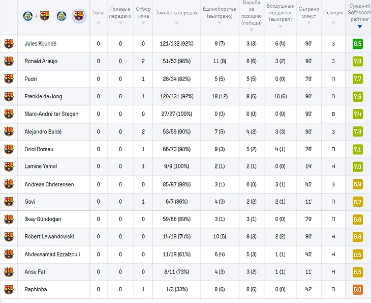 Оценки игроков «Барселоны» за матч против «Хетафе» от Sofascore
