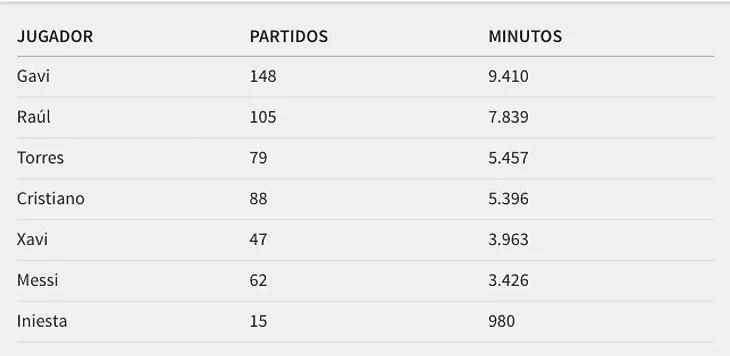 Гави регулярно выступает не только за сборную, но и за клуб. В тот день, когда Пабло порвал «кресты», ему было 19 лет, 3 месяца и 14 дней. К этому моменту он суммарно провел на поле за основу «Барсы» и сборной Испании 9 410 минут в 148 матчах. В сезоне 2021/22 он принял участие в 57 матчах, в сезоне 2022/23 – 76, в сезоне 2023/24 – 15. Журналисты As сравнили количество игрового времени Гави с временем, которое провели на поле экс-звезды Ла Лиги в возрасте Пабло. Ближе всего к полузащитнику «блауграны» подобрался Рауль. К 19-ти годам он провел на поле 7 839 минут, приняв участие в 105 матчах — на 43 игры меньше, чем Пабло. Вот, к каким результатам пришли журналисты As: