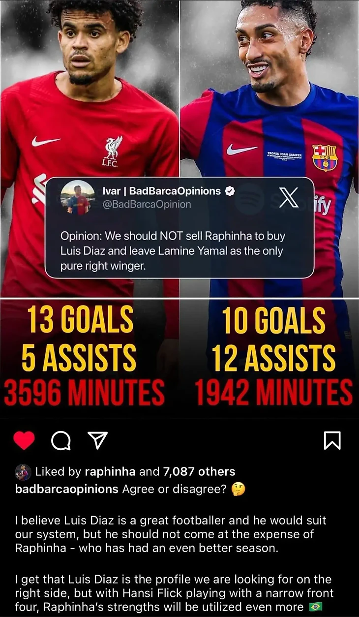 «Мы не должны продавать Рафинью, чтобы купить Луиса Диаса и оставить Ламина Ямаля единственным чистым правым вингером.