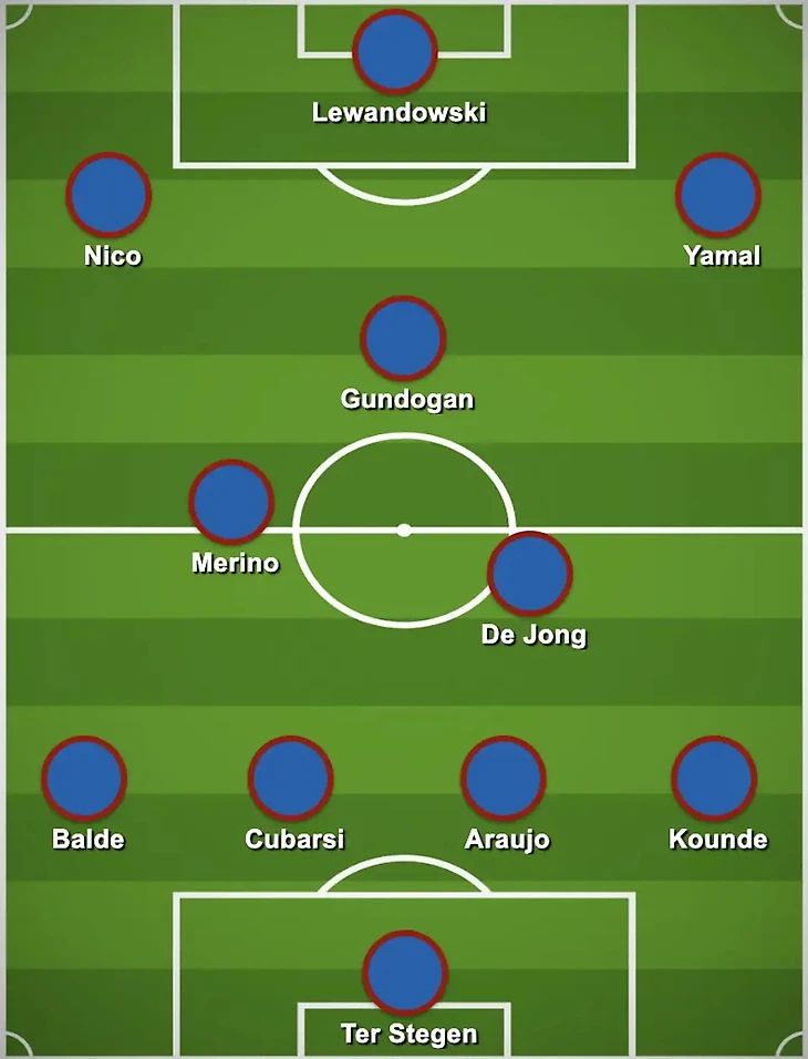 Что ж, давайте пофантазируем о том, как Ханси Флик мог бы использовать Нико в своем составе. Многие хотели бы видеть Ламина Ямаля и Нико в «основе» «Барсы». Их партнерство отлично работает в национальной сборной. Давайте также представим, что каталонцы преуспеют в борьбе за Микеля Мерино. Вот как тогда выглядел бы стартовый состав команды: