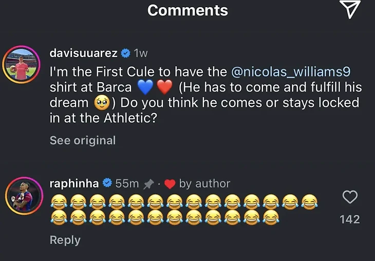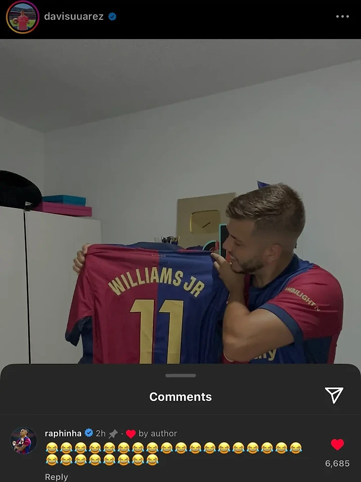 Рафинья, который, вероятно, сохранил этот пост для того, чтобы потом посмеяться, в конце концов, зашел в комментарии и отправил много смеющихся эмодзи. Спустя неделю после публикации поста!