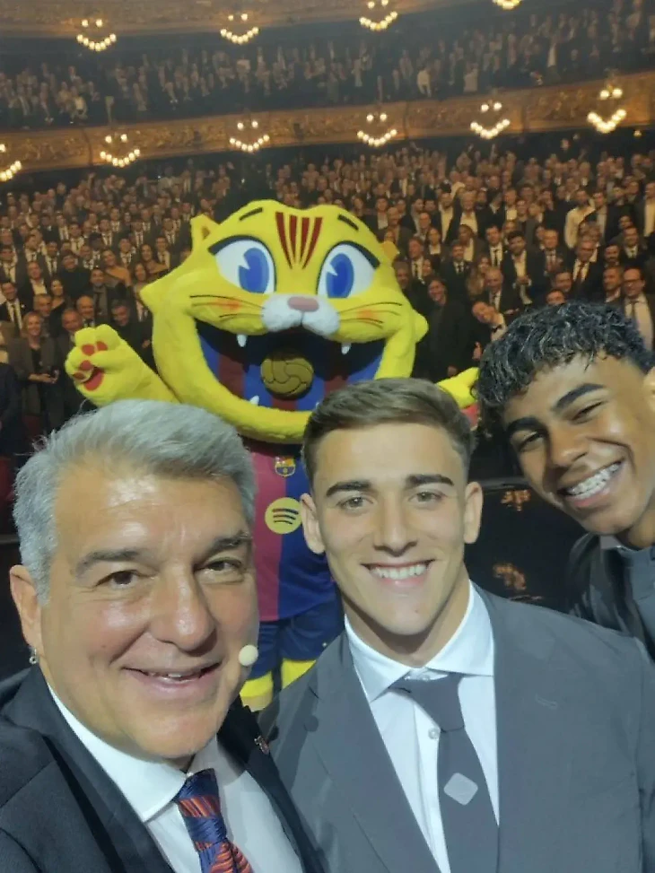На фото президент Барселоны Жоан Лапорта позирует для селфи с Гави, Ламином и CAT на заднем плане.