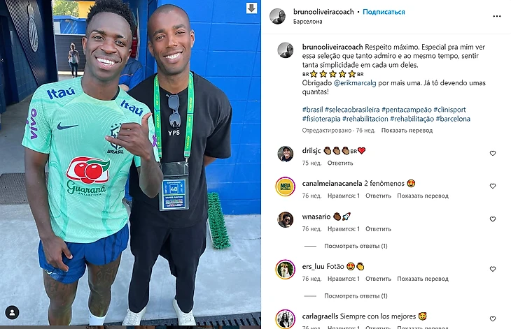 В соцсети фитнес-тренер выкладывал фото с Эриком Гранадой (мотогонщик, экс-участник Moto2, а сейчас − MotoE) и вингером «Мадрида» Винисиусом Жуниором.
