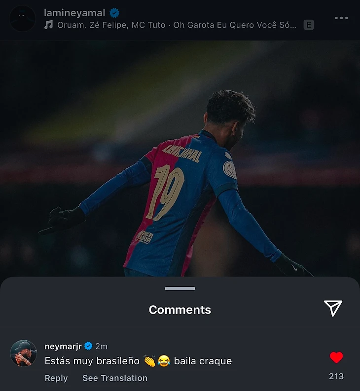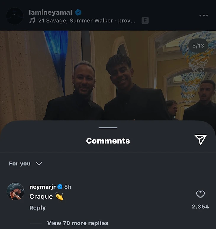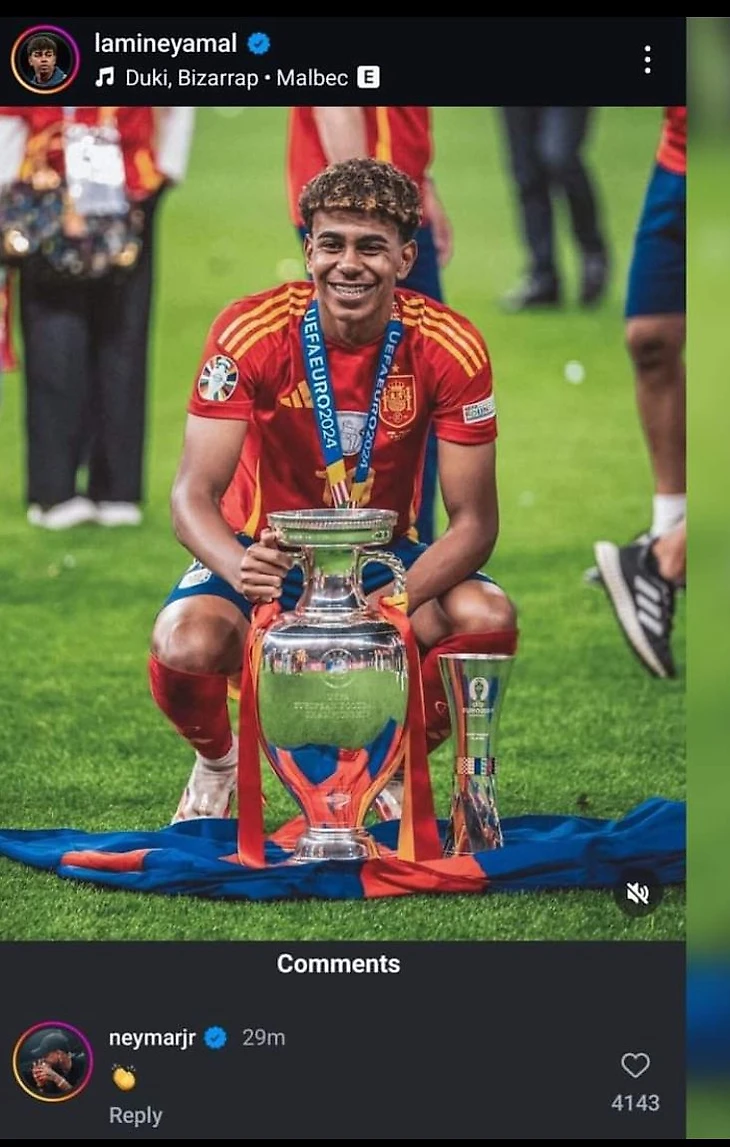 А что сам Неймар? Похоже, симпатия у футболистов взаимная. Бразилец регулярно комментирует публикации Ламина в соцсетях.