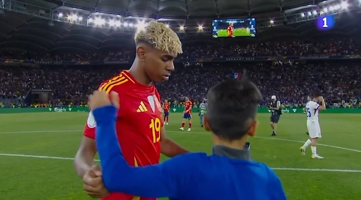 Когда прозвучал финальный свисток, на поле выбежал неожиданный нарушитель. Это был молодой парень, у которого была цель и средство: сфотографироваться с героем матча Ламином Ямалем. И тот ему не отказал.