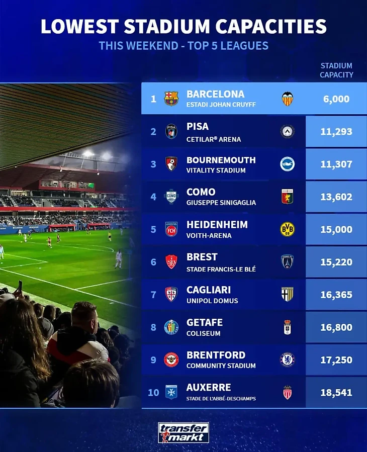 🔴 «Барса» громит 6:0 на стадионе всего на 6 тысяч мест! Вот самые маленькие стадионы топ-лиг