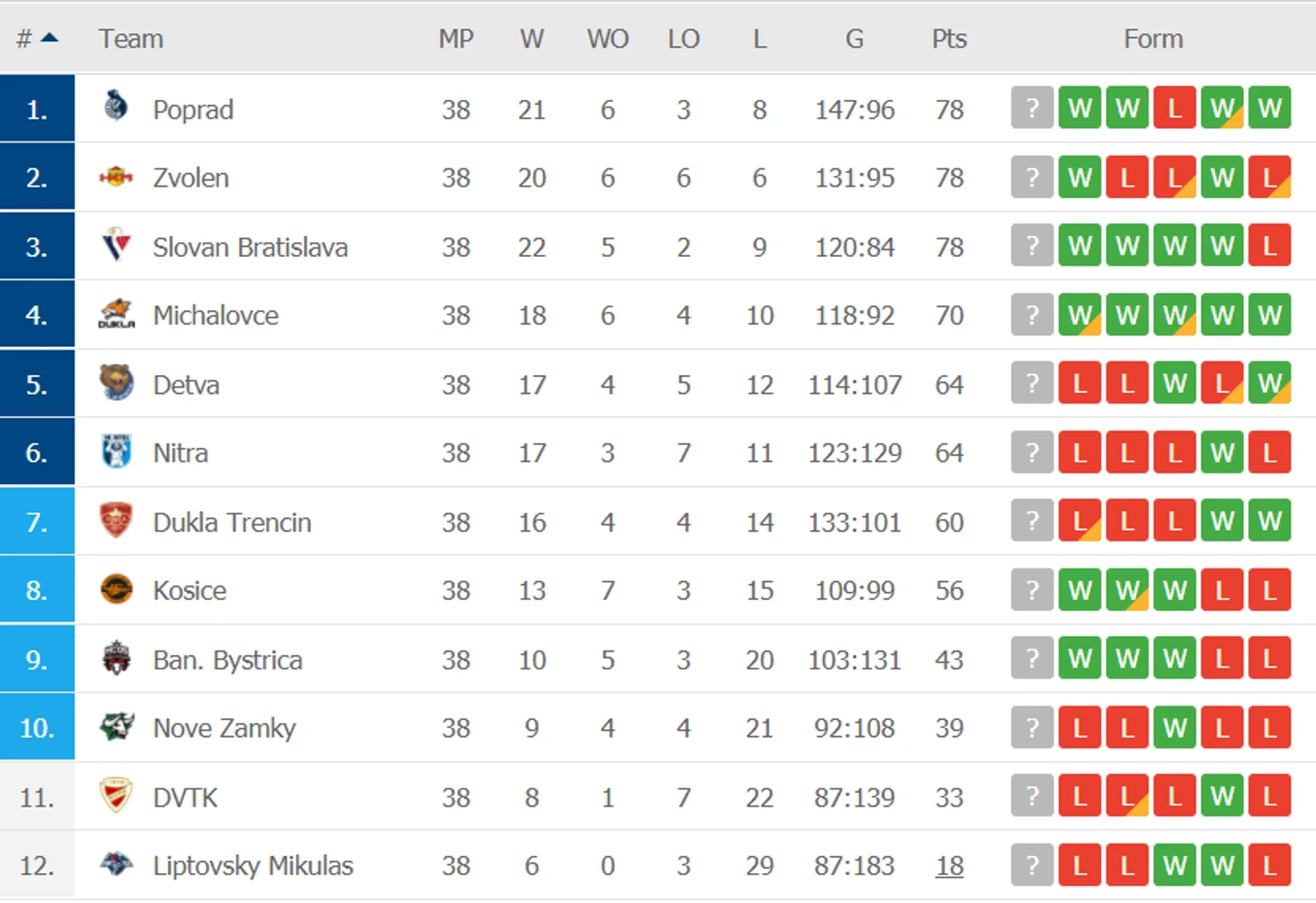 Ближе к финишу регулярки определились три команды, которые будут бороться за три самых высоких места в таблице. Это "Попрад", "Зволен" и"Слован" - на данный момент они имеют одинаковое количество очков и показывают самую качественную игру и наиболее стабильные результаты. Если не произойдёт сюрпризов, то именно эти клубы и поведут борьбу за чемпионский титул в плей-офф.