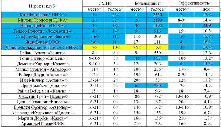 Дмитрий Хвостов, будучи одним из лидеров в голосовании СМИ, имеет показатель эффективности, который позволил бы ему играть и в сборной «эффективность». Известные, но уже возрастные игроки, Евгений Воронов и Сергей Быков у журналистов разделили 4 и 5 место. Сергей Быкову из-за позднего начала выступления в этом сезоне лиги ВТБ не хватило времени, чтобы набрать голоса болельщиков. Евгений Воронов был выбран журналистами в Сочи скорее всего за былые заслуги.