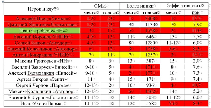 Активная поддержка болельщиков Красноярска и Саратова дала надежду на включение в число участников Василию Заворуеву, Алексею Вздыхалкину и Максиму Колюшкину. Увы, видимо СМИ внимательно посмотрели на показатель их эффективности и оставили этих ребят вне игры. Необходимо обратить внимание на эффективность игроков пермской «Пармы» Сергея Чернова и Ивана Ухова. Тренер Статистика точно бы взял их в свою команду.