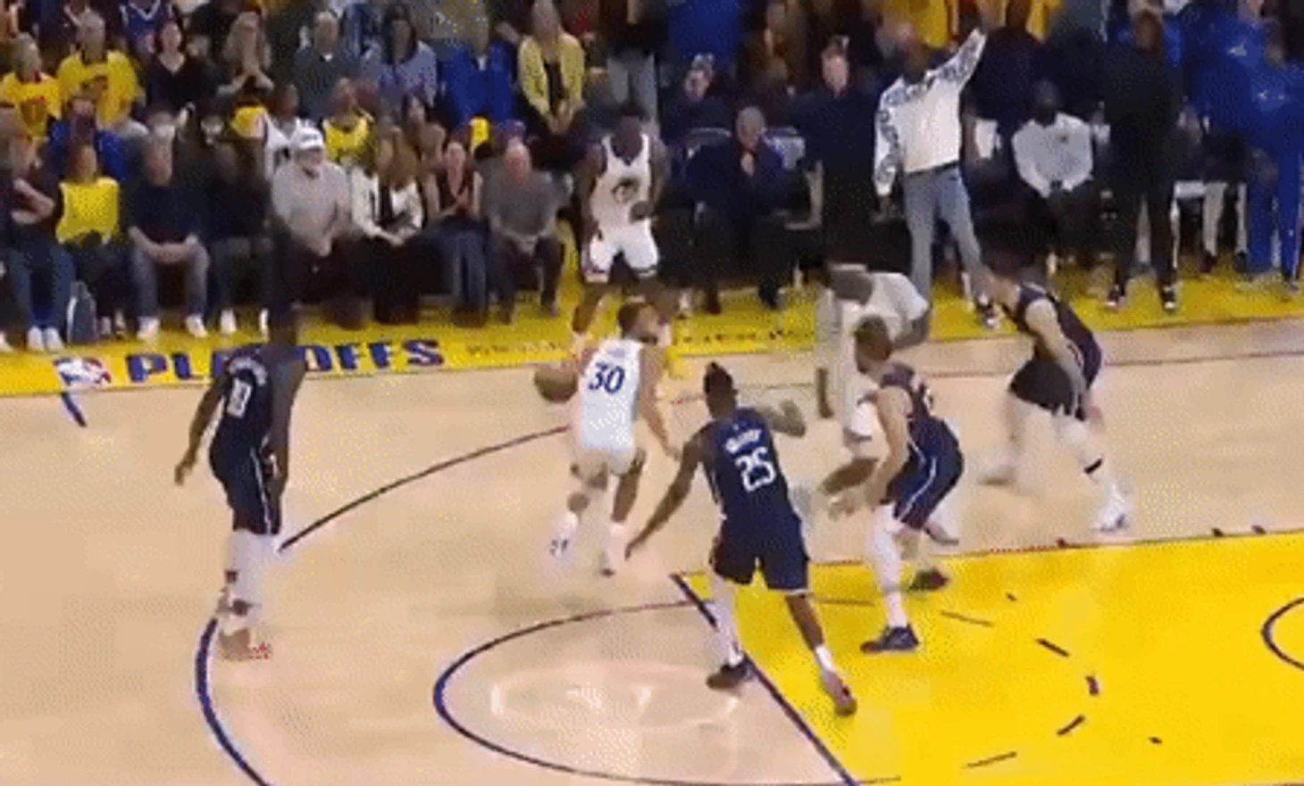 Кстати, за момент с пасом Карри сопернику в белом свитере «Даллас» наверняка ждет очередной штраф. Техасцы уже дважды получали от лиги штраф за то, что тренеры и запасные стоят слишком близко к краю площадки и мешают игре. В одном из моментов защитник «Уорриорз» Джордан Пул едва не споткнулся о ногу кого-то из «лишних» далласцев при трехочковом.