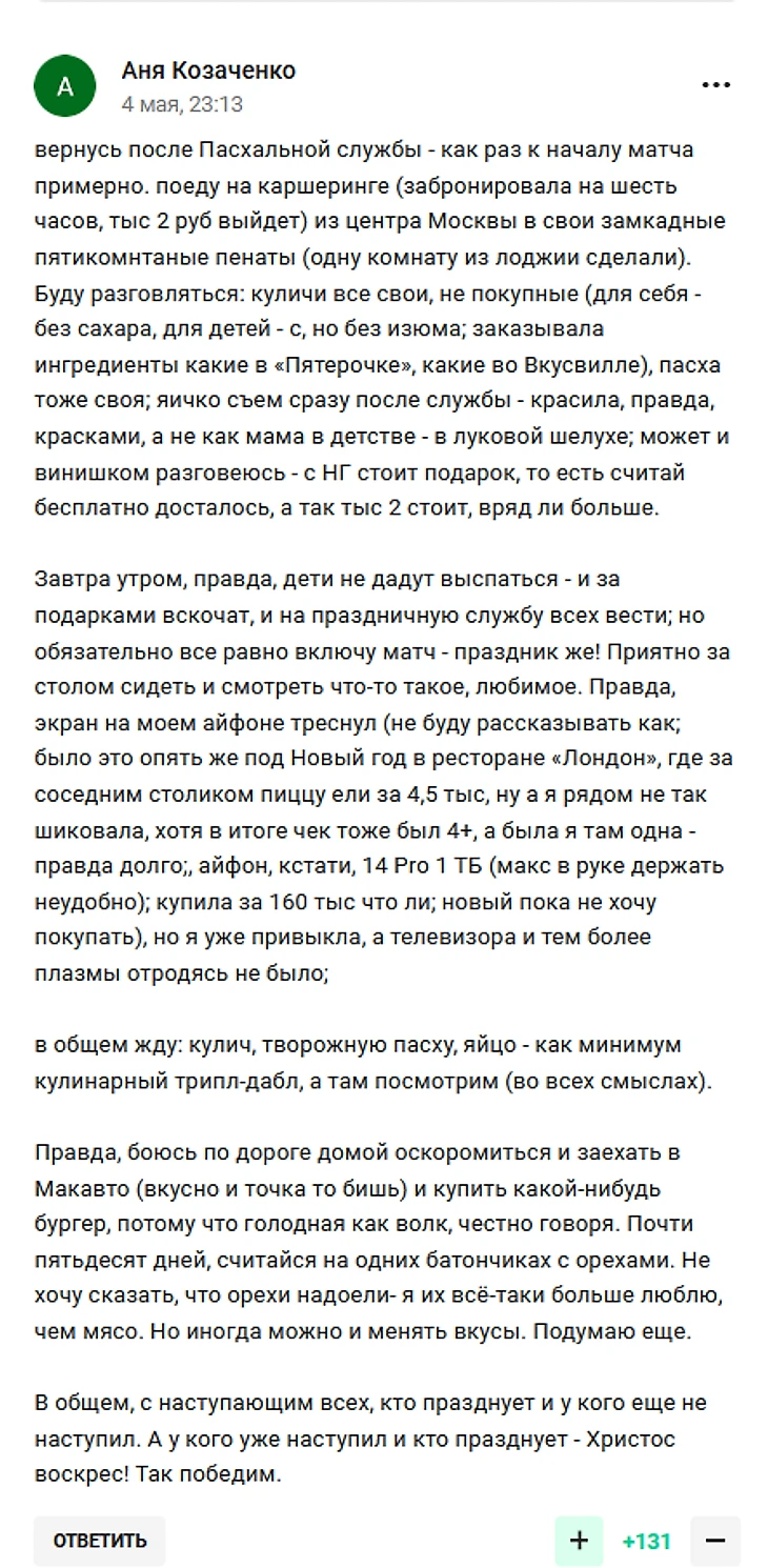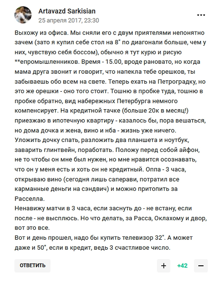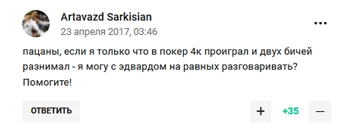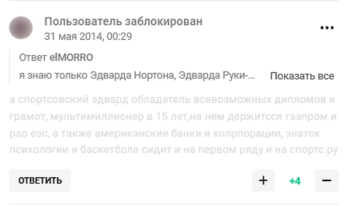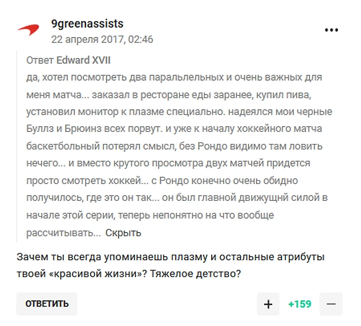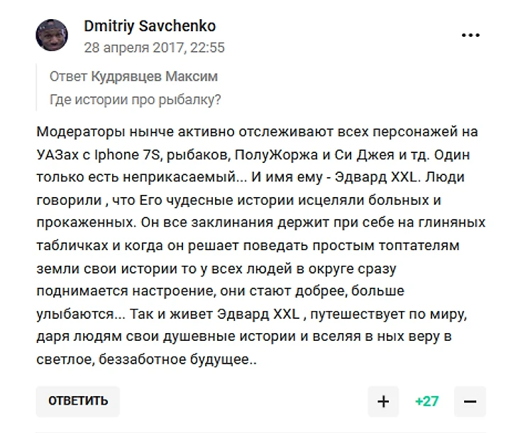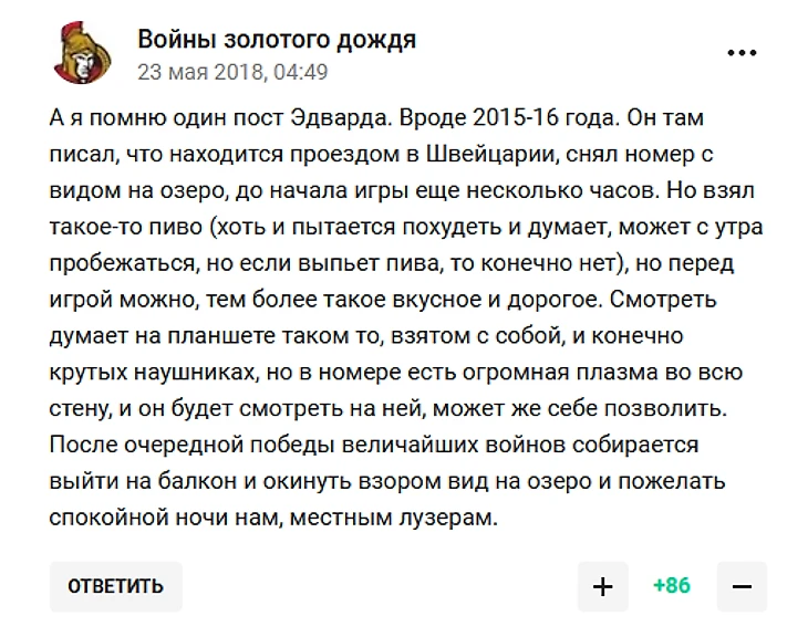 Во-вторых, практически одновременно не менее широкую известность в комментариях приобрел пользователь Эдвард XVII, который делился своими эмоциями от приобщения к большому спорту. Получалось у него, правда, не совсем однозначно: он, конечно, рассказывал о своем уникальном опыте, но при этом ярко подсвечивал подробности собственной жизни.