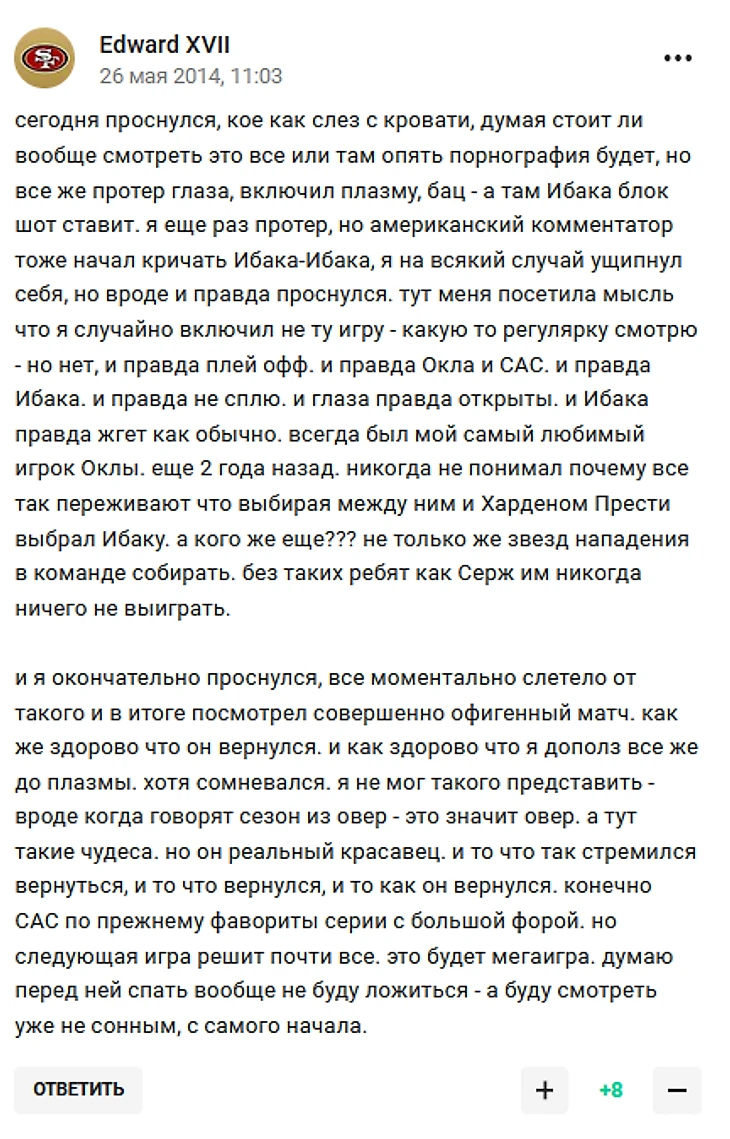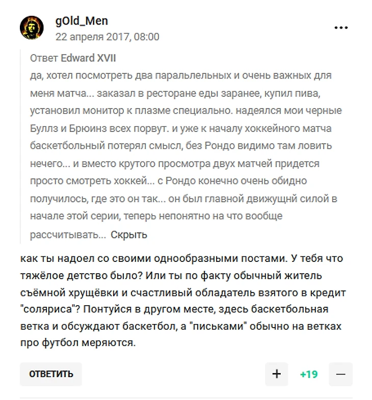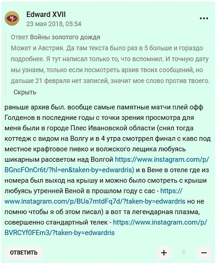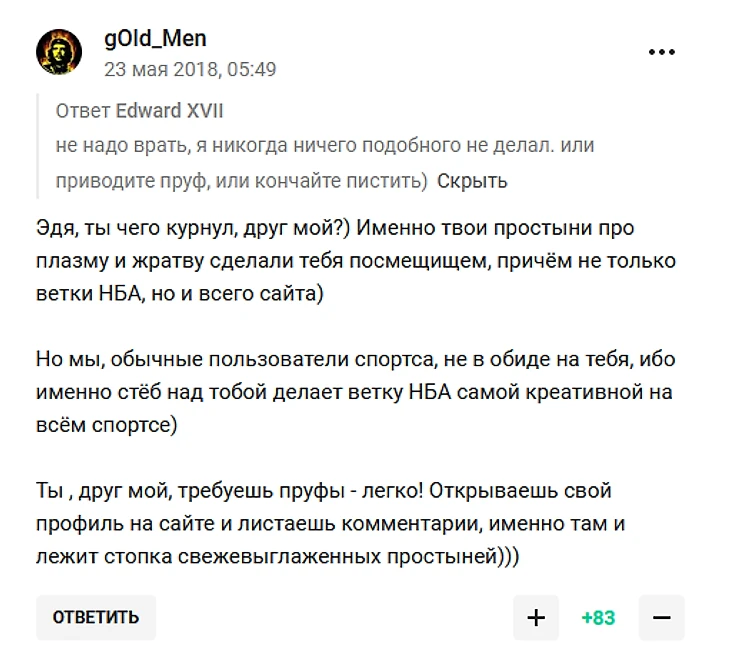 Именно Эдвард XVII и написал, так сказать, «нулевой комментарий», заложивший основы для традиции. Причем сделал он это не на баскетбольной ветке, а под текстом Виталия Суворова о «Ливерпуле».