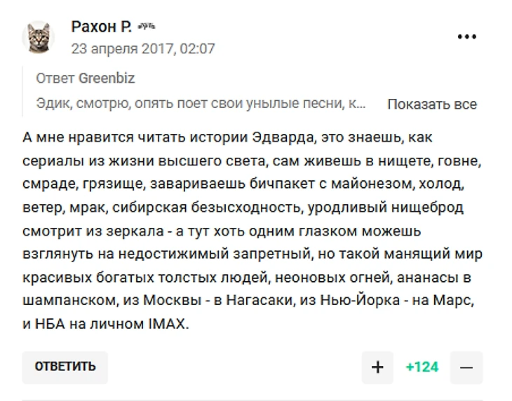 Случилось это в 2016 году. Сейчас «простыни» плюсуют, но тогда реплика Эдварда стала самой заминусованной.