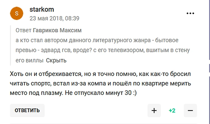В частности, еще с 2014 года Эдвард XVII настойчиво вставлял во все свои комментарии навязчивые упоминания о «плазме», которая позволяет ему смотреть спорт в более комфортном разрешении, чем это делают все остальные.