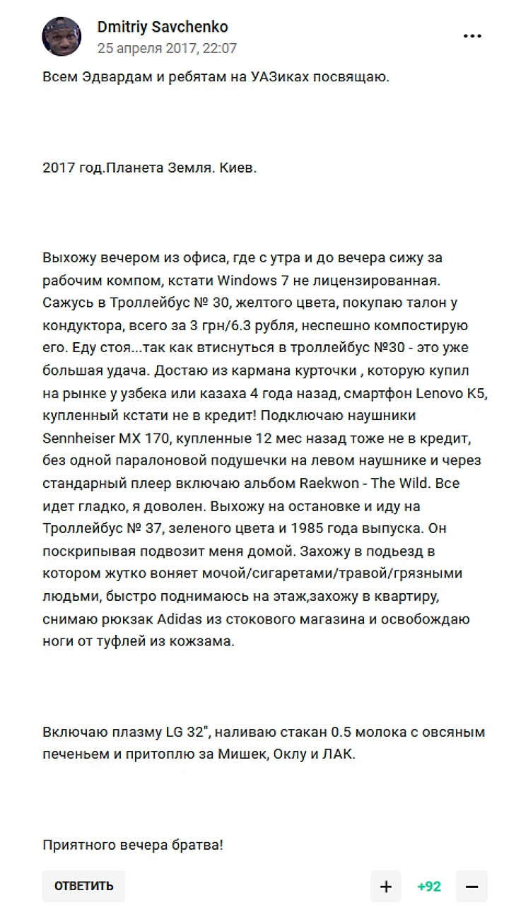 Отмашку дал юзер elephant12, который противопоставил «плазме» и прочим атрибутам гламура родной УАЗ. Это еще не было заходом на «простыню», просто ироничным отзывом на творчество Эдварда.