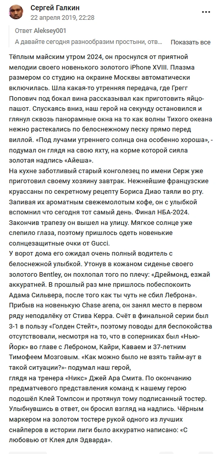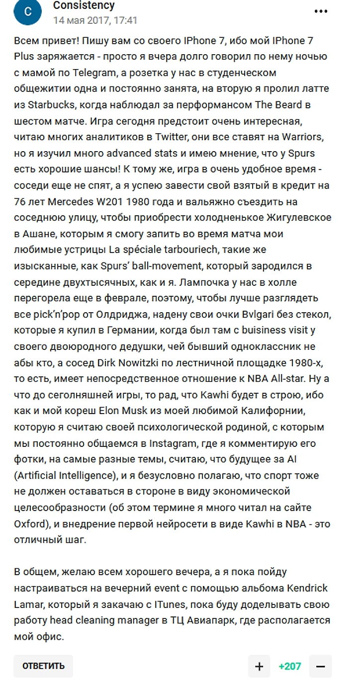 И вот весной 2017 все сошлось воедино. Из смешения «простыней про рыбалку» и «простыней» Эдварда о его любимой (и всех в тот момент максимально раздражающей) команде «Голден Стэйт» родился новый жанр: «простыни о просмотре НБА», пародирующие манеру основоположника…