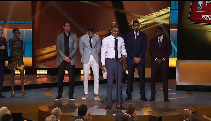 3:15 Вот и первая награда, которую объявили еще до церемонии: Расселл Уэстбрук признан самым стильным игроком НБА по версии болельщиков. На откуп публике в этом году дали несколько наград, придуманных специально для голосования в соцсетях: за лучшие данк, блок, ассист, победный бросок, лучшее выступление в регулярном сезоне, лучший момент в плей-офф. Ну и за лучший стиль, да.