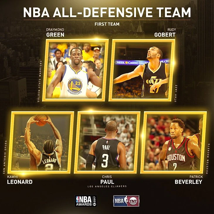 В первую сборную по защите попали Дрэймонд Грин, Кавай Ленард, Руди Гобер – эти трое также финалисты на звание Лучшего защищающегося игрока сезона – а также Крис Пол и Патрик Беверли.