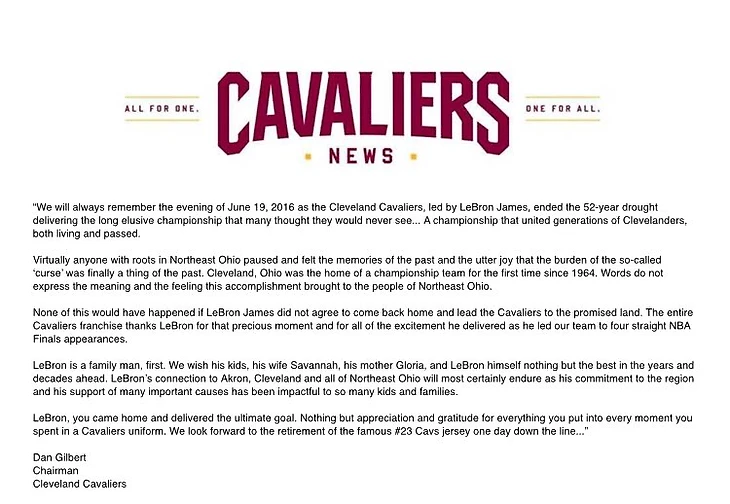Тут и пожелание счастья детям, жене и маме Леброна, и обещание вывести номер из обращения, благодарность за преодоление 52-летней чемпионской засухи в городе.