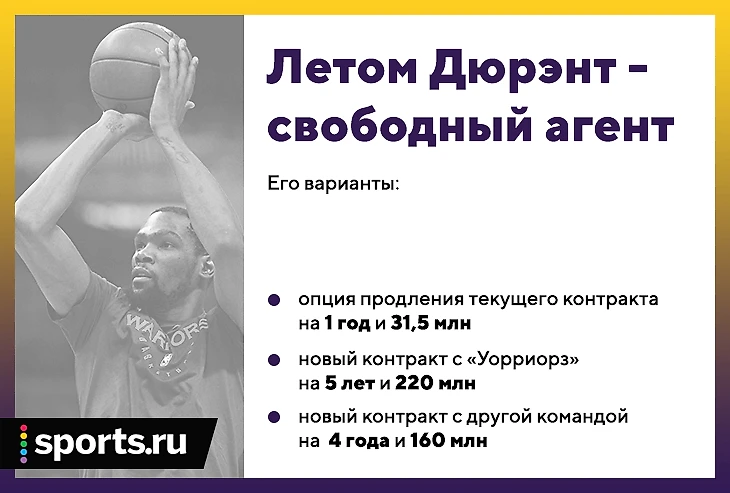 У Дюрэнта пока что действующий контракт с «Уорриорз». В контракте есть опция игрока, позволяющая ему продлиться с клубом еще на 1 год за 31,5 млн. Это меньше максимального контракта примерно на 6-7 млн.