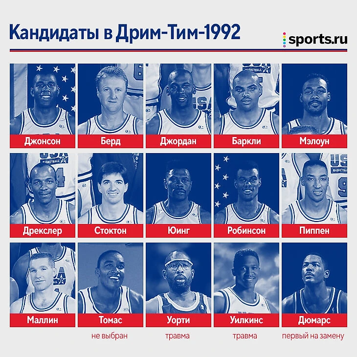Конечно, собирали команду не по итогам сезона-91/92 и даже не по его ходу – план по комплектованию состава придумали еще в феврале 1991 года, 10 первых участников (без Лэйттнера и Дрекслера) объявили в сентябре, до старта сезона, когда окончательно убедили Лэрри Берда присоединиться. Здоровый Уилкинс мог претендовать на последнюю позицию, но порвал ахилл – в 1994-м и его позовут в команду на ЧМ.