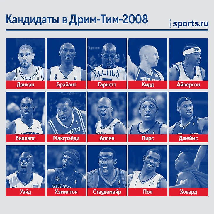 Напомним, что за реальную «Команду искупления» с Кобе, Леброном, Киддом, Уэйдом, Полом и Дуайтом выступали также Карлос Бузер, Майкл Редд, молодые Бош, Кармело и Дерон Уильямс, а из «Детройта» поехал не Биллапс, не Хэмилтон и даже не Шиди Уоллес – а незвездный, но очень полезный Тэйшон Принс. Та команда была составлена из звезд, но молодых, старше 30 был только Кидд. Кобе тогда считался дядькой-наставником – а вот в составе на картинке сразу 7 человек старше Брайанта.