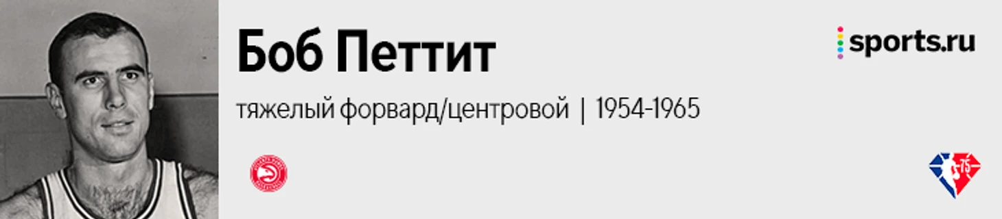 Первый профессиональный баскетболист, решивший «подкачаться», и благодаря физподготовке Боб практически не пропускал игры из-за травм. Надежный, как молот, стабильный, как наковальня. Никто за 75 лет НБА не набирал так много очков со штрафной линии, как Петтит – 7,8 в среднем за игру. Первый MVP в истории (награду ввели только в 1956-м), взял и второе звание в 1959-м, а за год до того стал единственным, кто одолел в финале НБА «Селтикс» Билла Расселла – 50 очков в последней игре серии!