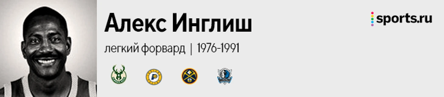 Главный баскетболист в истории «Денвера», 8-кратный олл-стар, 20-й в истории НБА по набранным очкам и самый результативный игрок 1980-х Алекс Инглиш – игрок той же позиции, той же роли и той же эпохи. Они одновременно с Дэнтли пришли в лигу в 76-м и ушли из нее в 91-м, перебравшись доигрывать в Италию. А в 1996 году переезд в Европу вместо старения в НБА считался признаком слабости – жюри ведь не включило ни Уилкинса, ни Макаду.