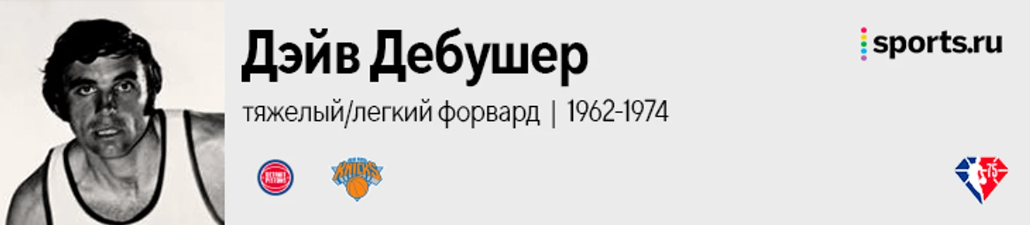 Когда в 1968 году Бинг стал самым результативным игроком НБА, вместе с ним «Детройт» (уже в третий раз подряд) на Матче всех звезд представлял один из лучших оборонительных форвардов в истории – Дэйв Дебушер. А меньше чем через год Дебушера обменяли... «Никс» получили недостающий элемент для своего чемпионского паззла: самую трудолюбивую звезду НБА. Дебушер спокойно принимал роль третьей-четвертой скрипки в системе «Нью-Йорка», а ценить его не перестали: Дэйв попадал на МВЗ еще пять раз, завоевал два перстня, а как только в НБА стали определять сборные по защите, Дебушер попадал в первую пятерку каждый раз до самого конца карьеры.