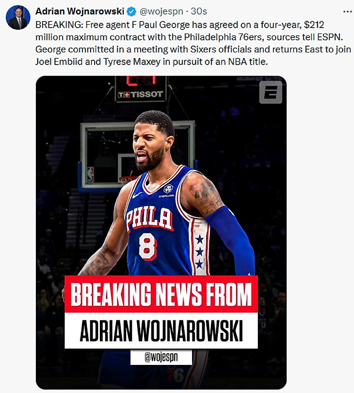 Крис Хэйнс (не Водж и не Шамс, но примерно №6 в мире инсайда НБА) говорит, что оптимизм в «Филадельфии» по поводу подписания Пола Джорджа растет.