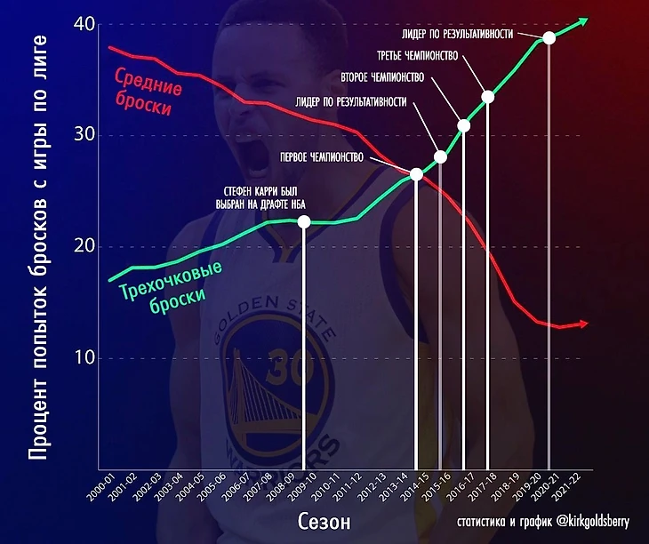 Карри произвел революцию в баскетболе и кардинально изменил всем нами любимую игру. На представленном графике вы можете увидеть, как изменилось количество средних и 3-очковых бросков, после прихода Стефена в лигу. На данный момент ему только 33, он демонстрирует великолепную игру и в таком темпе отметка в 4000 трехочковых не за горами. Возможно, в будущем найдётся кто-то, кто сможет побить рекорд, но по моим ощущениям это будет ой как не скоро.
