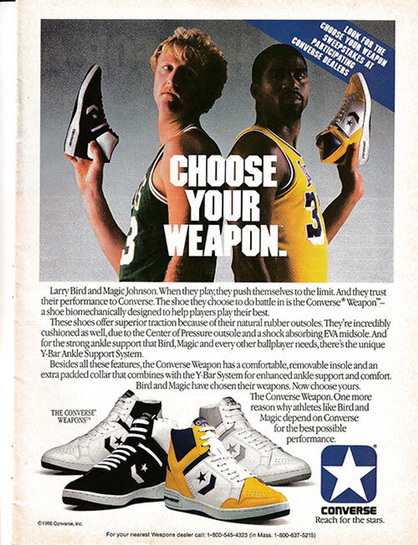 Так или иначе, но в 80-х Берд с Мэджиком были амбассадорами Conversе и главными дуэлянтами в НБА. И самый пик этой перестрелки пришелся как раз на выход Converse Weapon. В 1984-м Мэджик и «Лейкерс» проиграли в финале Берда и «Селтикс». 7-й матч той серии был самой рейтинговой игрой из показанных по телевидению на тот момент. На протяжении всей серии телевизионщики акцентировали внимание на персональной неприязни между лидерами команд. Это было видно невооруженным глазом, но медиа выкручивали соперничество двух легенд на максимум. Финал-1985 стал ремейком предыдущего противостояния, но с противоположным исходом. На сей раз победили «Лейкерс», более того, чемпионство было добыто на площадке соперника, и Мэджик с друзьями торжествовал на глазах переполненного «Бостон-Гардена».
