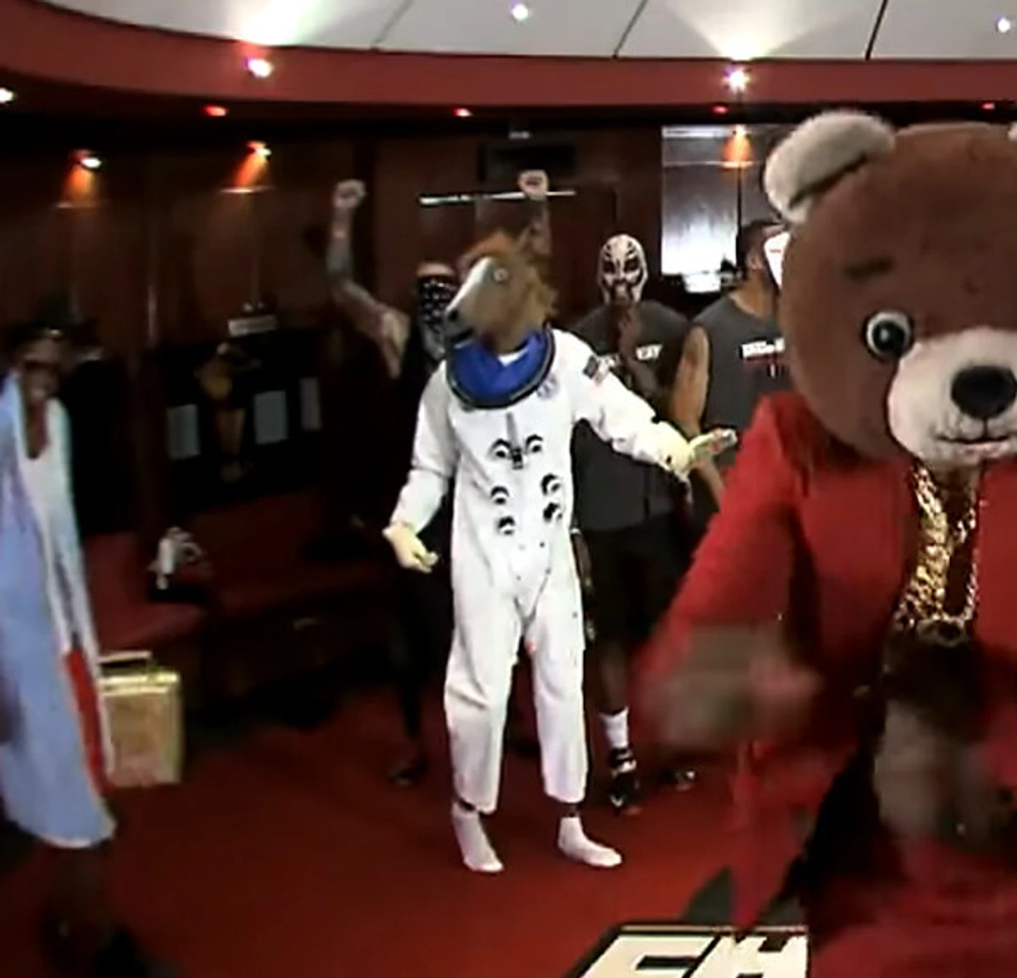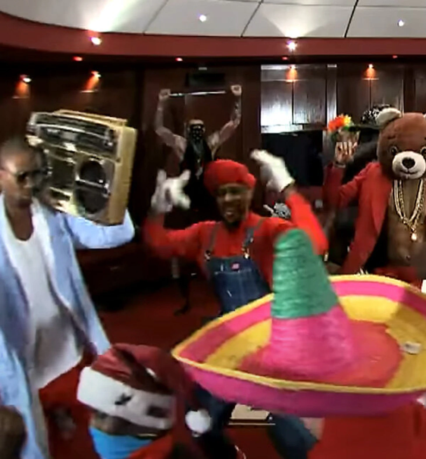 Уэйд надел огромную маску игрушечного медведя, которая вместе с дорогим красным костюмом и золотыми цепями напомнила образ альтер-эго Канье Уэста с его ранних альбомов «The College Dropout», «Late Registration» и «Graduation».