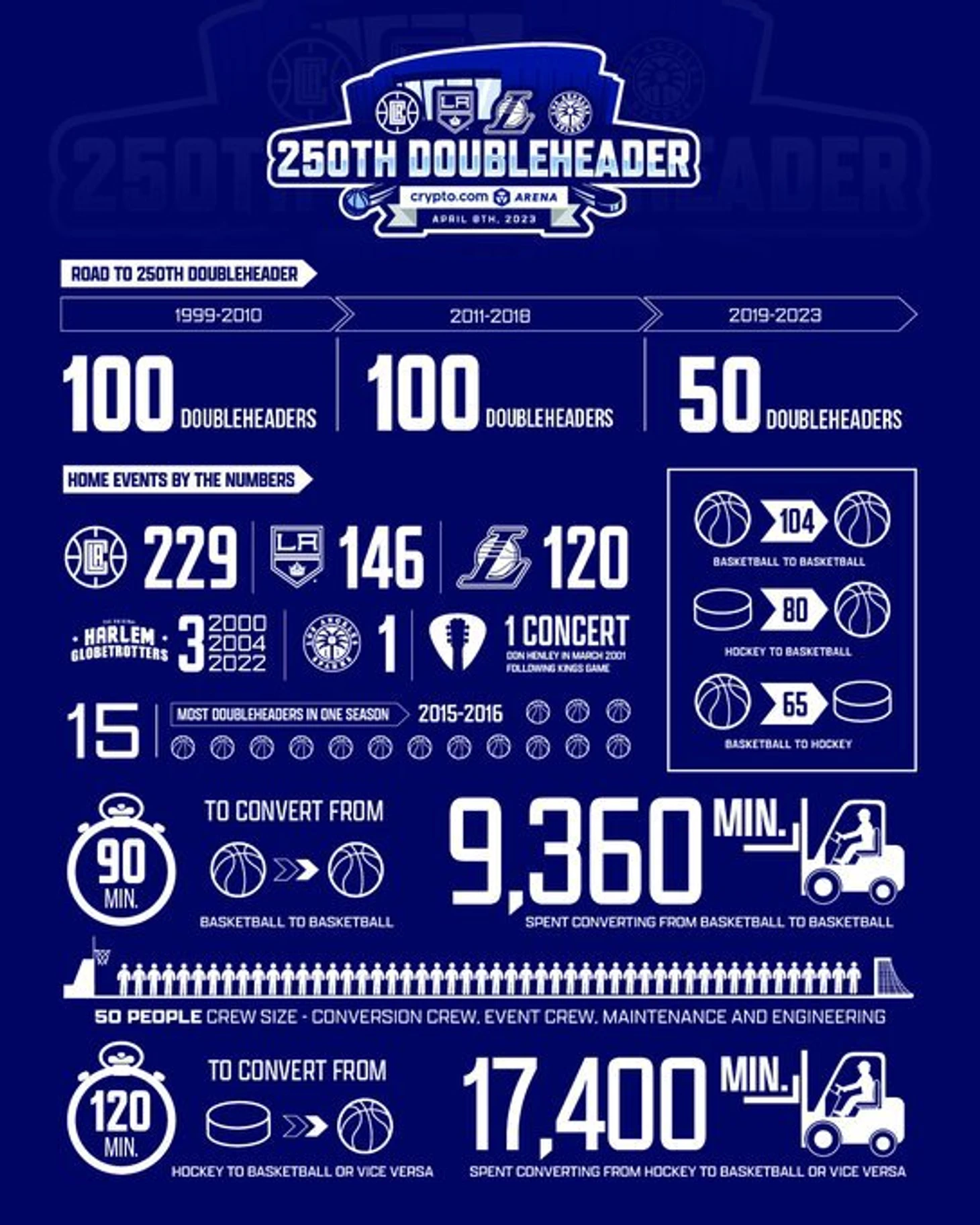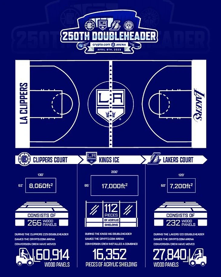 Doubleheader – это ситуация, при которой два лос-анджелесских клуба играют дома с промежутком буквально в пару часов. За это время работники арены должны полностью поменять паркет и антураж площадки (баннеры, цвета, символику, оформление посадочных мест). В конце регулярки «Криптоком Арена» отметила юбилей – 250-й Doubleheader (играли «Клипперс» против «Блейзерс» и «Кингз» против «Эвеланш»). В честь чего официальный аккаунт арены поделился шикарной инфографикой с массой интереснейших деталей о феномене домашней площадки лос-анджелесских клубов.