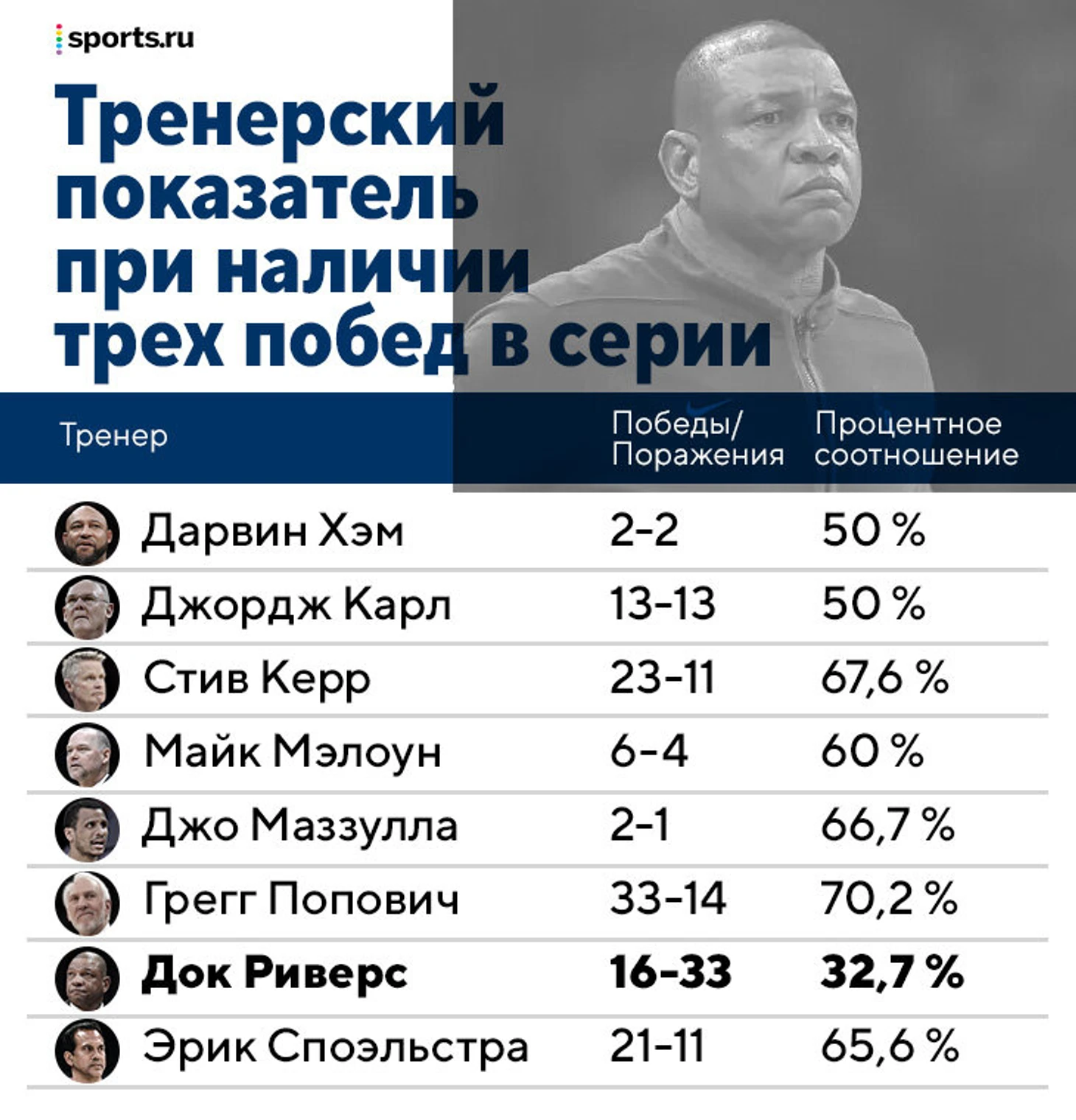 Репутация Риверса трещит по швам, даже если отвлечься от седьмых матчей. Во всех сериях плей-офф, где команды Риверса одерживали три победы, показатель у Дока – 16-33 (32,7%). И даже на таком уровне старина Док не вывозит – ни против опытных аксакалов, ни даже против тех, для кого этот сезон первый в качестве главного.