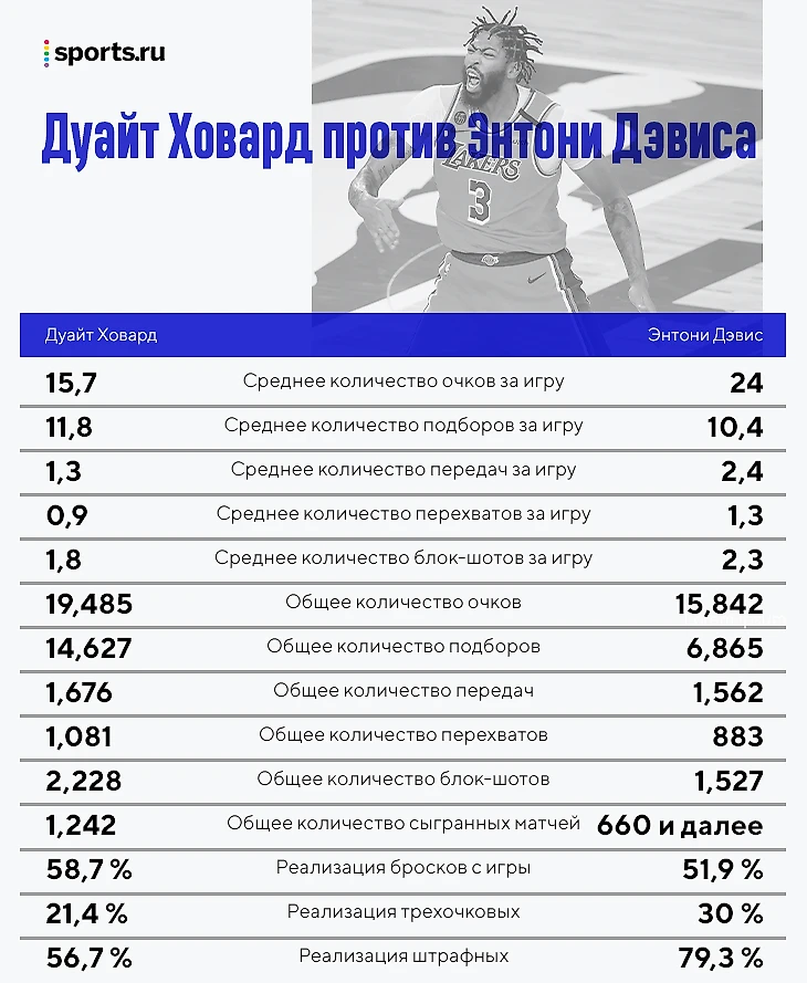 Выдающаяся игра Дэвиса в том финале, казалось бы, не оставляет Ховарду никаких шансов в сравнении. Если только мы ограничиваем собственный кругозор, когда с сожалением смотрим на того, кто давным-давно считался самым доминирующим игроком лиги. Но если не прятать голову в песок, то мы увидим, что великолепный Дэвис за свои 11 лет в НБА выходил в постсезонку всего пять раз, в трех из которых делал это, оперевшись на плечо Леброна.