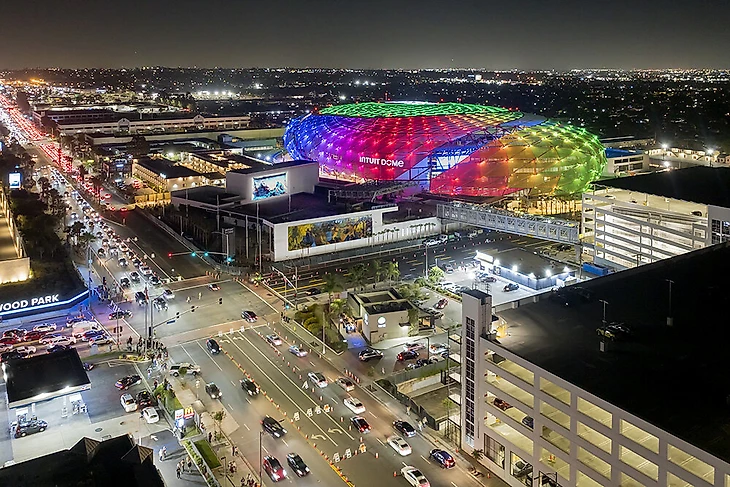 «Интуит Доум», как и большинство современных арен НБА, расположен отнюдь не в чистом поле. Новый магнум-опус Балмера построен на территории комплекса Hollywood Park, частью которого является «Соу Фай Стэдиум» – дом клубов НФЛ «Лос-Анджелес Чарджерс» и «Лос-Анджелес Рэмс.