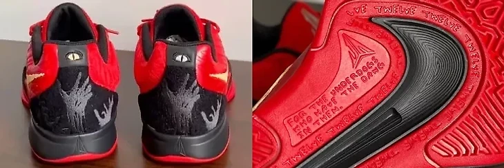 Собственное имя Джа не стал упоминать, зато решил напомнить о себе за счет житейской мудрости. На подошве красуется слоган – для андердогов, внутри которых чувствуется пес (в какой-то степени это тоже отсылка – к вою оборотня). Тут же рядом памятка, напоминающая нам под каким номером выступает разыгрывающий – слово «twelve» (двенадцать) окаймляет объемный символ Nike.