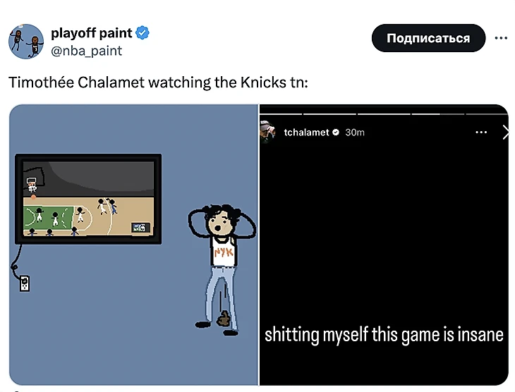 Наконец, стоит упомянуть, что в отличие от большинства знаменитостей, набивающихся в «Гарден» и рвущих на груди худи Balenciaga во имя любви к «Никс», Шаламе «пробивает выезды». Он присутствовал на гостевом матче в Индианаполисе, где привычно подгонял «Никс».