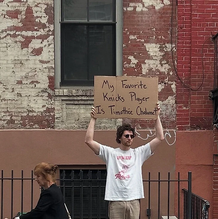 Человек-мем Сэт Филлипс, более известный как «Чувак с плакатом», чье количество подписчиков составляет 7,5 млн, появляется на улицах Нью-Йорка с табличкой: «Мой любимый игрок «Никс» – Тимоти Шаламе».