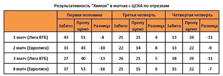Лишь в самой первой игре нынешнего сезона «Химки» смогли навязать планомерную борьбу ЦСКА. В матче Лиги ВТБ подопечные Барцокаса долгое время шли вровень с фаворитом, но в концовке все же развалились (81:96). Остальные же три встречи соперников проходили по схожему сценарию. Армейцы захватывали инициативу уже на стартовом отрезке и создавали комфортный отрыв в первой половине. Подмосковные баскетболисты в какой-то момент вдруг просыпались, выдавали ударный отрезок и дарили надежду на борьбу. Но в конечном итоге красно-синие «тормозили» соперника и доводили дело до победы.