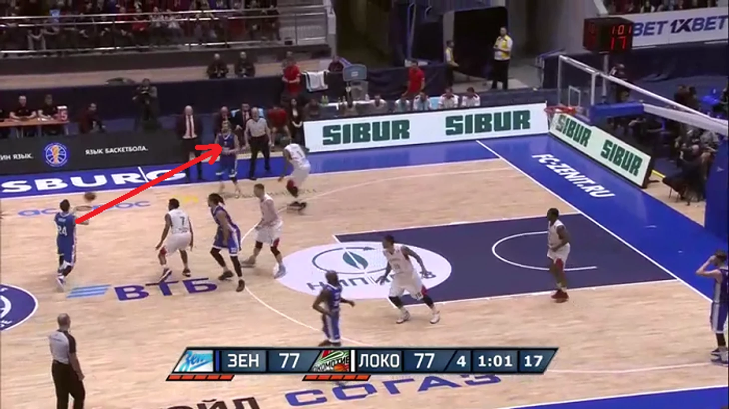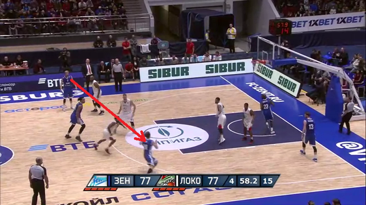 На последней минуте встречи питерцы трижды выводили своих снайперов на открытый бросок с дистанции. В первом случае хозяева разыграли простое взаимодействие. Кайл Курич с дриблингом ушел в центр и отдал мяч на край Сергею Карасеву.