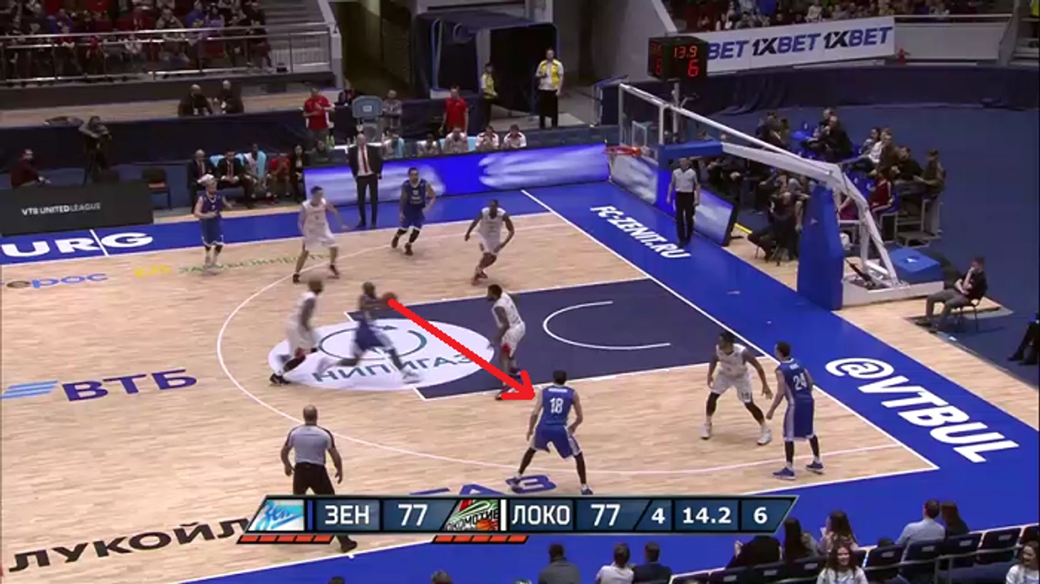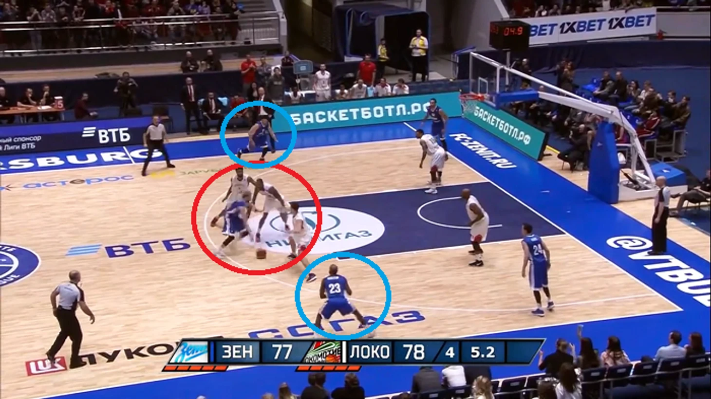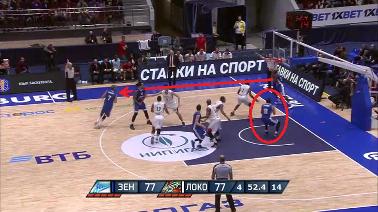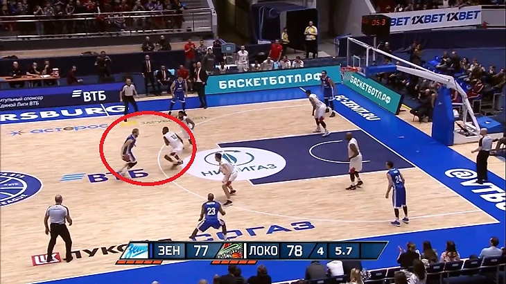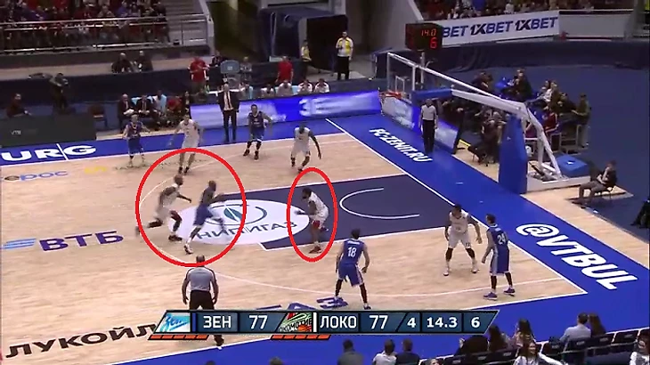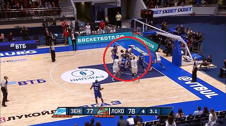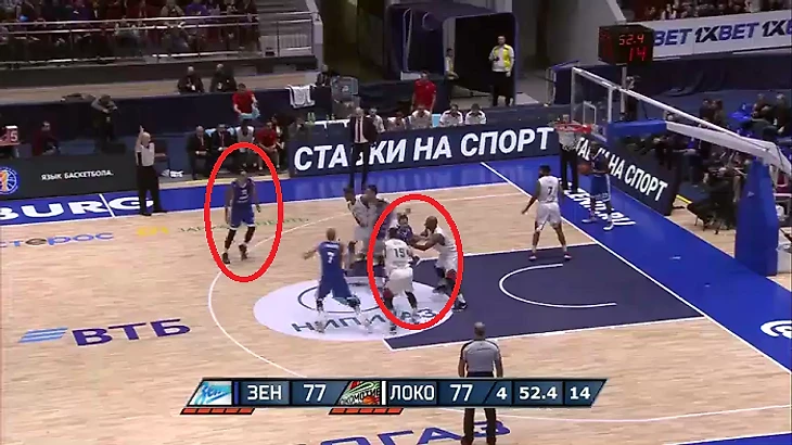 В этой атаке стоит отметить несколько нюансов. Например, рванувший в проход Карасев стянул на себя сразу трех игроков «Локо». При этом «брошенными» оказались двое баскетболистов «Зенита» – Гриффин и Воронов.