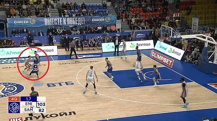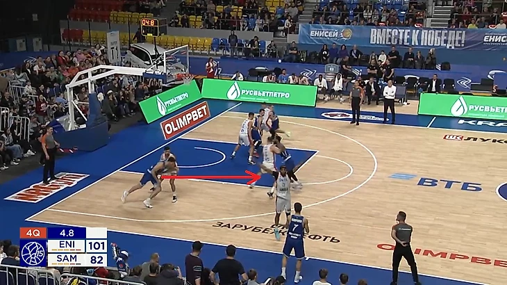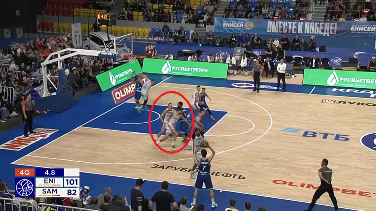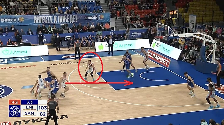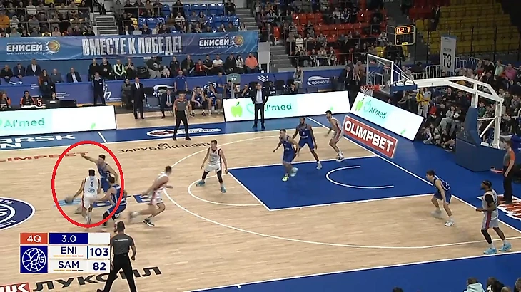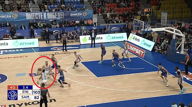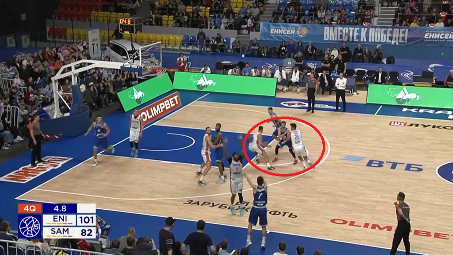 Сложно сказать, какая задумка была у тренерского штаба «Самары». Но, судя по тому, что Платонов высоко вышел (скорее всего, для заслона под Ребича), а Гудумак без раздумий устремился под кольцо, расчет был именно на проход сербского разыгрывающего. Если бы Ребичу удалось прорваться к трехсекундной зоне «Енисея», то в зависимости от реакции обороны сибиряков он мог бы атаковать сам, скинуть мяч Гудумаку или отдать передачу в угол на Хокинса.
