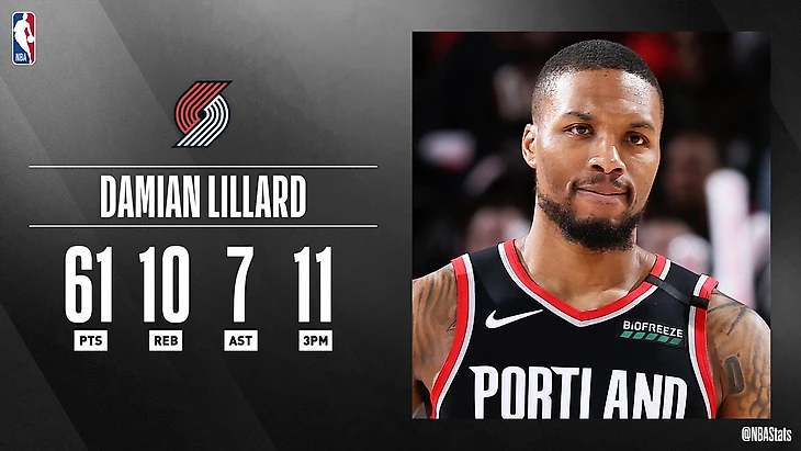 Дэмиан не только издевался над корзиной соперника, но и . С момента объединения лиг в 1976 году всего четыре человека набирали 60+ очков, 10+ подборов и 5+ передач за одну игру: Харден, Макгрэйди, Дэвид Робинсон и, конечно же, Джордан. Теперь сюда входит и Лиллард (61+10+7).