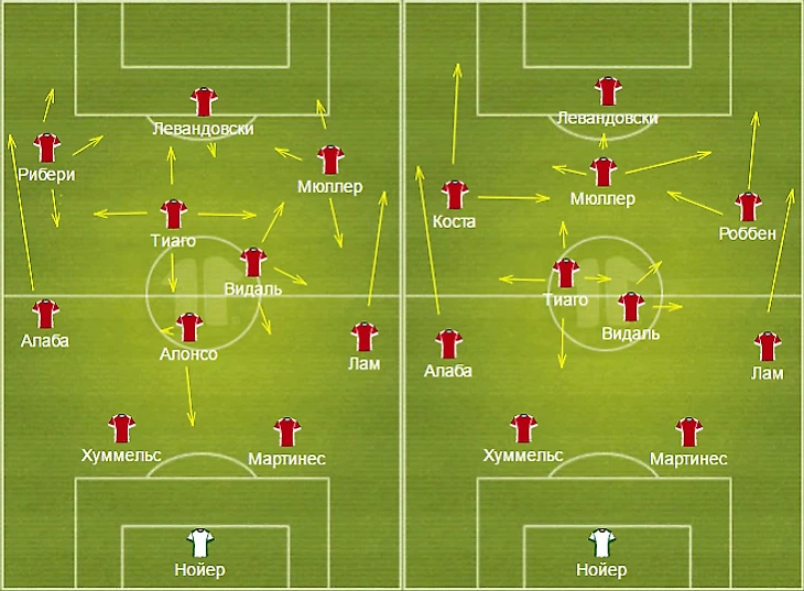 Тем не менее, самым главным изъяном расстановки 4-3-3 является полное закрытие в ней самого эффективного игрока «Баварии». Томас Мюллер, помимо своей невероятной самоотдачи, оставался в первом круге полезен лишь тем, что умел великолепно находить свободное пространство и правильно пользоваться им. Но всякий раз начиная игру на правом фланге, он практически растворялся на поле, лишая команду остроты в данной зоне. Ситуацию необходимо было исправлять.