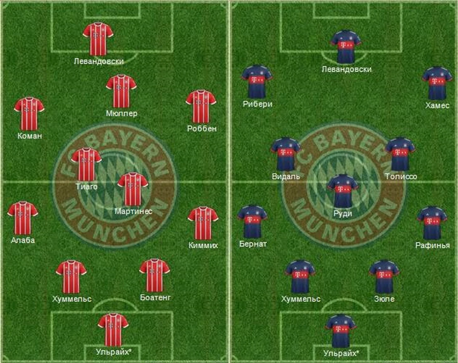 Что же сейчас? Защита примерно укомплектована, есть четверка старта и Зюле, Рафинья, Бернат на подхвате. В атаке по-прежнему есть лидеры в лице Мюллера и Роббена и хорошая конкуренция на две оставшиеся позиции. Однако в середине поля яблоку некуда упасть. К счастью, в аренду ушел Ренату Саншеш, но зато снова вернулся Мартинес, который занял ключевую позицию. На роль его напарника претендуют 4 игрока, каждый по-своему заслуживающий быть в основе. Свободный художник Тиаго, умный работяга Руди и два активных бокс-ту-бокс Корентен Толиссо и Артуро Видаль. Двое последних пока чаще других и страдают.