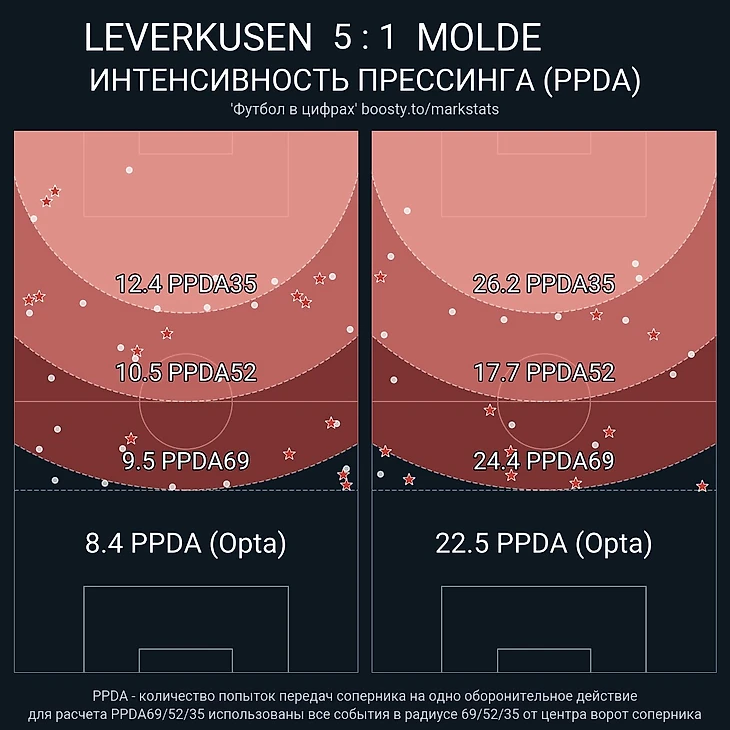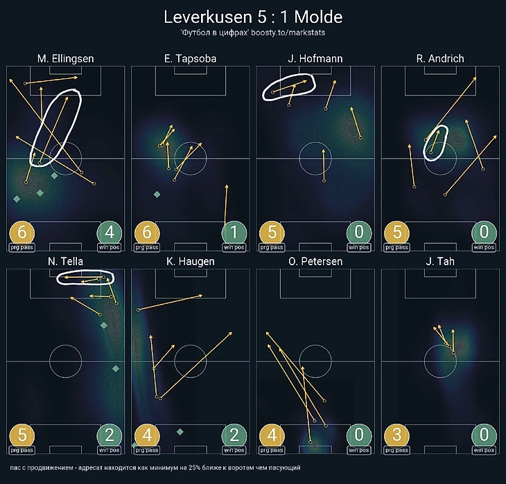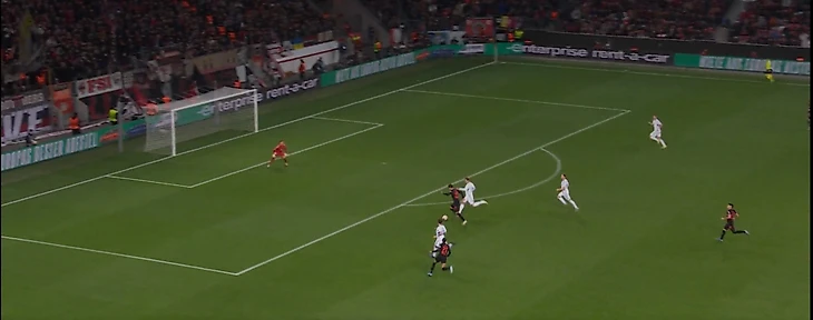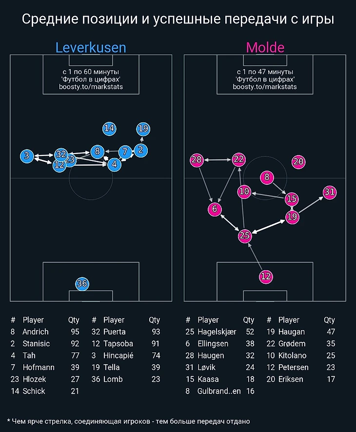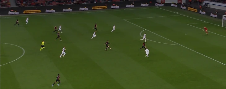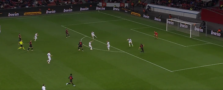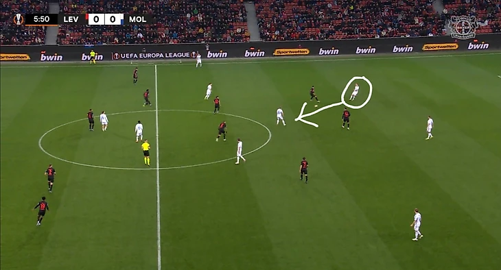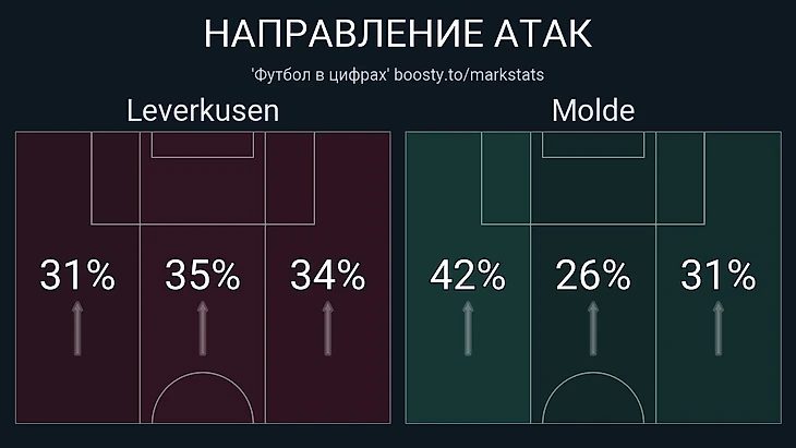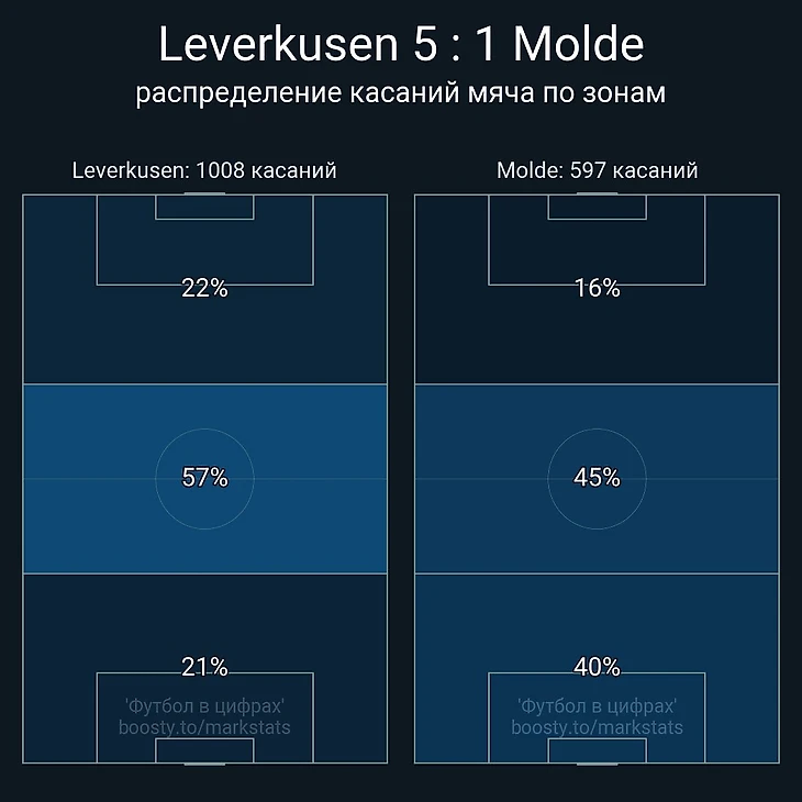Байер Леверкузен начал доминировать с самого начала матча: уже через шесть минут Роберт Андрих перехватил мяч после плохой передачи от защитника Мольде на их половине поля и с первого касания отдал пас в на Патрика Шика.