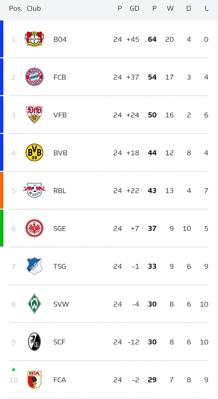 Таблица Бундеслиги также рисует свою чрезвычайно приятную картину. Подопечные Хаби Алонсо превосходят «Баварию» на 10 очков за 10 оставшихся матчей и в общей сложности потеряли всего восемь очков в первых 24 матчах сезона.