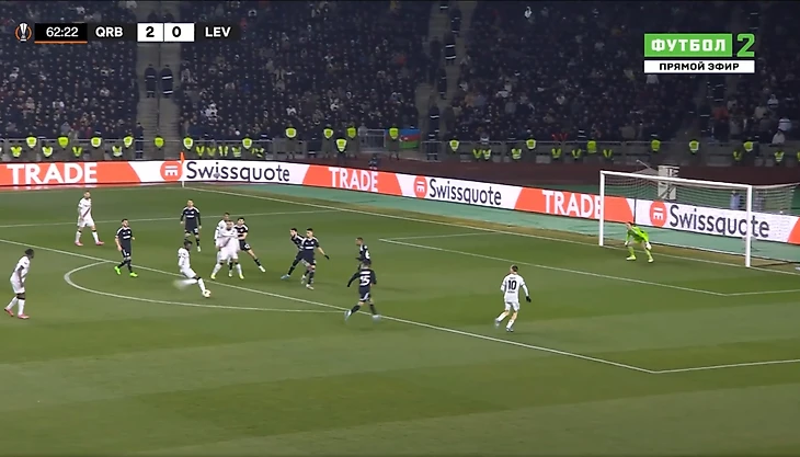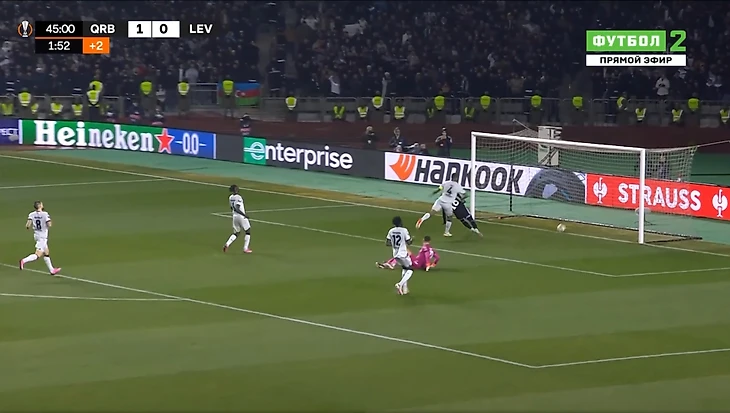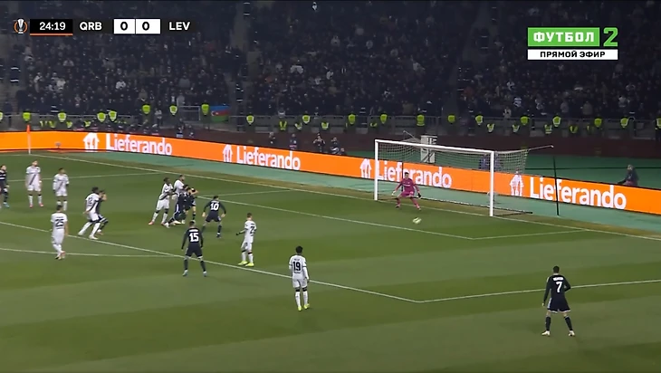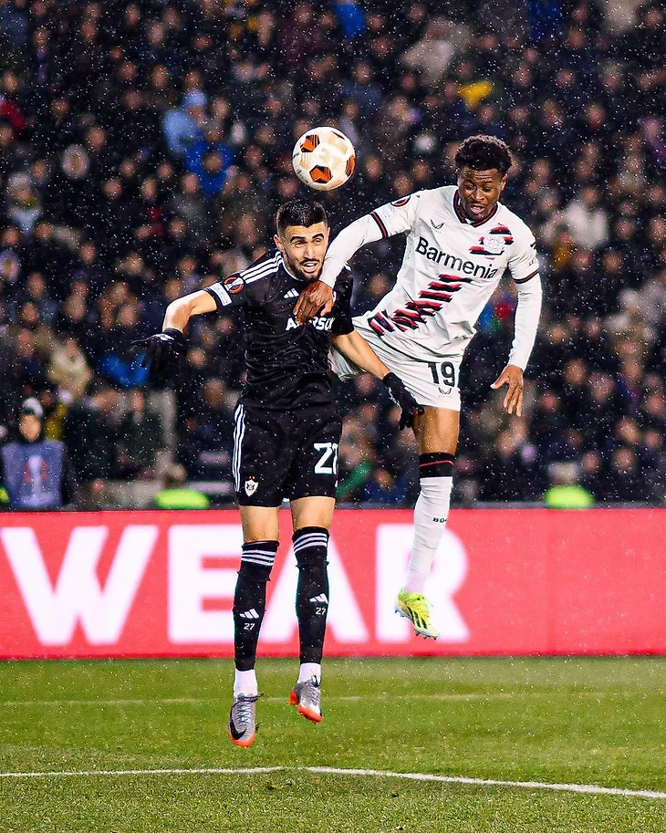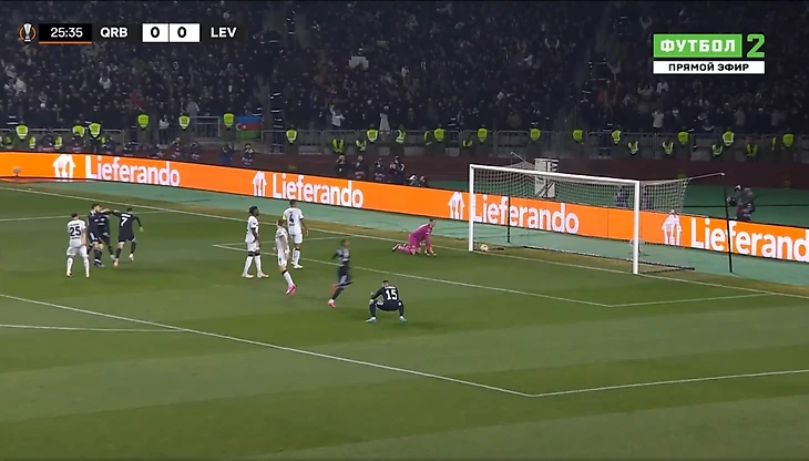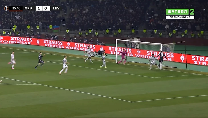 Через минуту защита Леверкузена допустила серьезную ошибку на своей половине поля, и Жуниньо сумел отобрать мяч: бразилец затем отдал его партнеру по команде Бензиа в центре, и тот сделал счет 1:0 в пользу азербайджанцев.